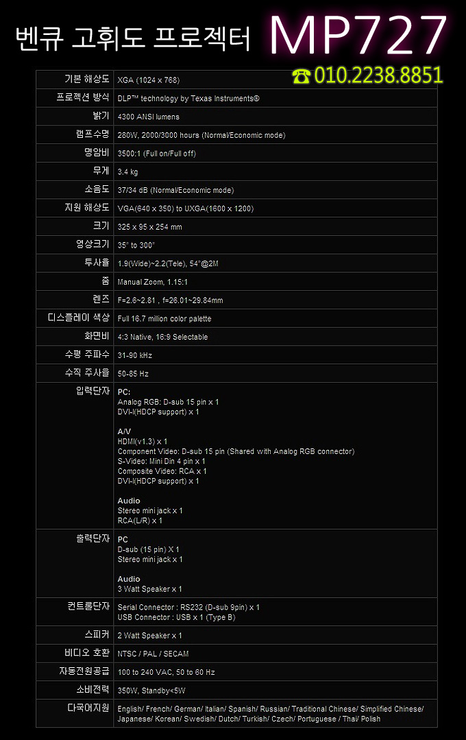 HDMI 1.3 Áö¿ø ÇÁ·ÎÁ§ÅÍ º¥Å¥ Áß°íºöÇÁ·ÎÁ§Æ® MP727 HDMIÀÇ 1.3´ÜÀÚ¸¦ žÀçÇÏ¿©