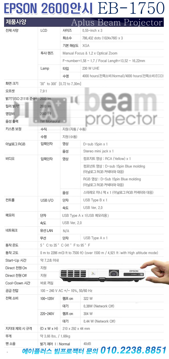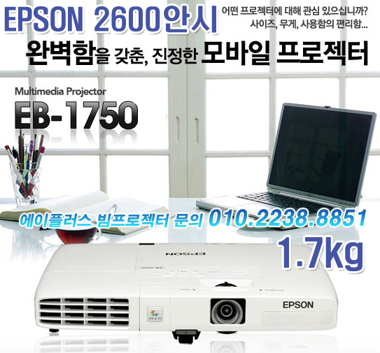 ¿¦¼Õ EB-1750G 2600¾È½Ã XGA±Þ ÃʼÒÇü / 1.7Kg ´ÜÃÊÁ¡ USB·ÎPC¿¬°á ³»À彺ÇÇÄ¿1W