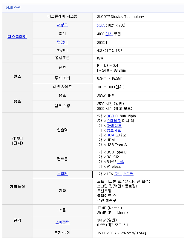 ¼ÒÀ½ 37dB, Ãâ·Â341W, ´ÜÃÊÁ¡ ·»Áî žÀç·Î 300Çü ½ºÅ©¸°(ÃÖ´ë), WiFi