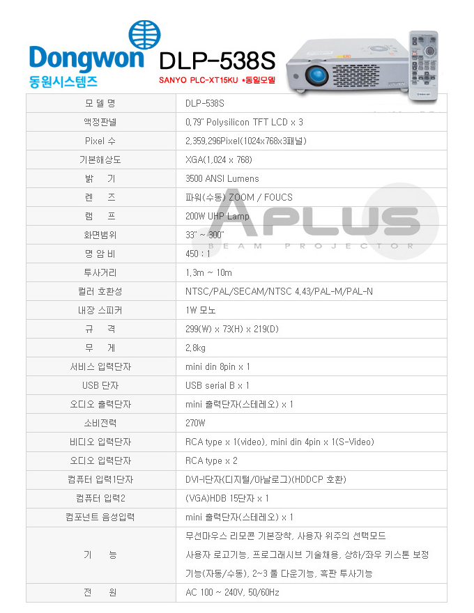 µ¿¿ø DLP-538S ÇÁ·ÎÁ§ÅÍ´Â »ê¿ä°øÀå¿¡¼ Á¦Á¶ÇÑ SANYO PLC-XT15KU¿Í °°Àº ¸ðµ¨·Î