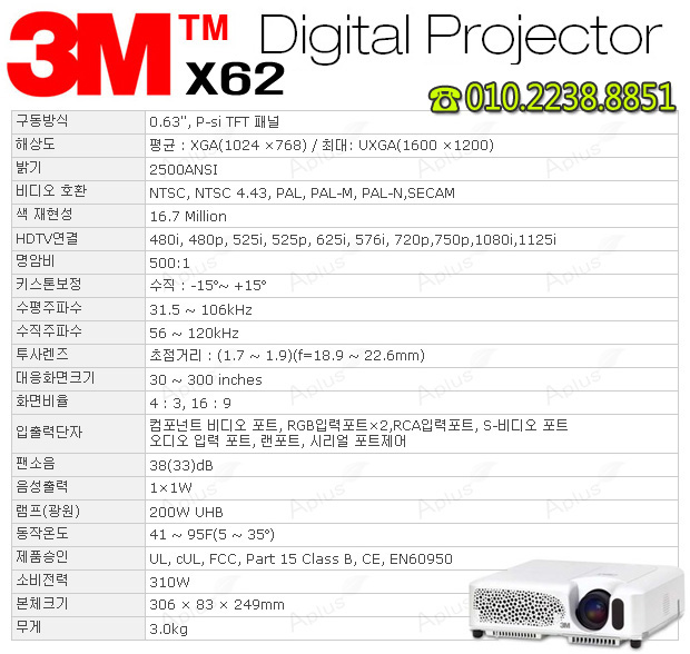 3M µðÁöÅÐ ÇÁ·ÎÁ§ÅÍ / LCD¹æ½Ä / 2500¾È½Ã / XGA(1024x768) / ¸í¾Ïºñ500:1 / ȸéºñ16:9,4:3 Ű½ºÅ溸Á¤ / 38dB, / 310W / µà¾óRGB / D-SUB / ÄÄÆ÷³ÍÆ® / ÄÄÆ÷ÁöÆ® / S-VHS / µðÁöÅÐ4¹èÁÜ *Á¦Ç°»çÀÌÁî 306x249x83(mm) / 3.0kg
