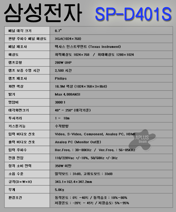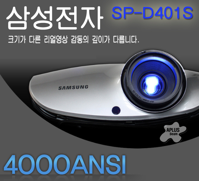 »ï¼º SP-D401S °íÈÖµµ Àß ¸¸µé¾îÁø ¹à±â ÁÁÀº Áß´ëÇü °ø°£¿ë Áß°íºöÇÁ·ÎÁ§Æ® ÆË´Ï´Ù. ÇÁ·ÎÁ§ÅÍ Åõ»ç¹æ½ÄÀº DLPÀ̸ç, 4000¾È½Ã·ç¸àÀÇ Áß°í ºöÇÁ·ÎÁ§ÅÍ ÀÔ´Ï´Ù. XGAÇØ»óµµ¸¦ ¹ÙÅÁÀ¸·Î ¼±¸íÇÑ ¶Ç·ÇÇÑ ¿µ»óÀ» Á¦°øÇϸç, ¸í¾Ïºñ´Â 3000:1ÀÔ´Ï´Ù.